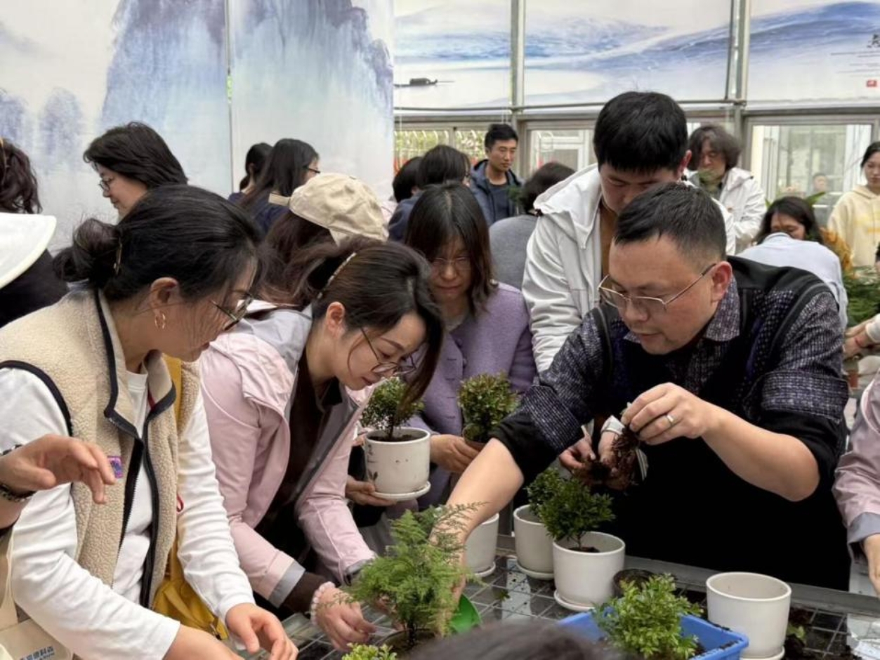 座谈会后,教职工一行前往湖南省植物园科研温室开展生态研学。大家近距离观察了珍稀植物、热带植物群落,学习植物保育与生态修复知识,在专业视角下重新感知植物的多样性与生命力。随后,活动进入“植物心灵疗愈”实践环节。在园艺疗法师的指导下,教职工们亲手制作绿植微景观,从选材、构图到栽种、装饰,将园林设计专业知识融入动手操作,沉浸式体验植物带来的平静与疗愈。大家纷纷表示,在花草之间放慢了节奏,缓解了工作压力,也进一步深化了对植物美学的理解。